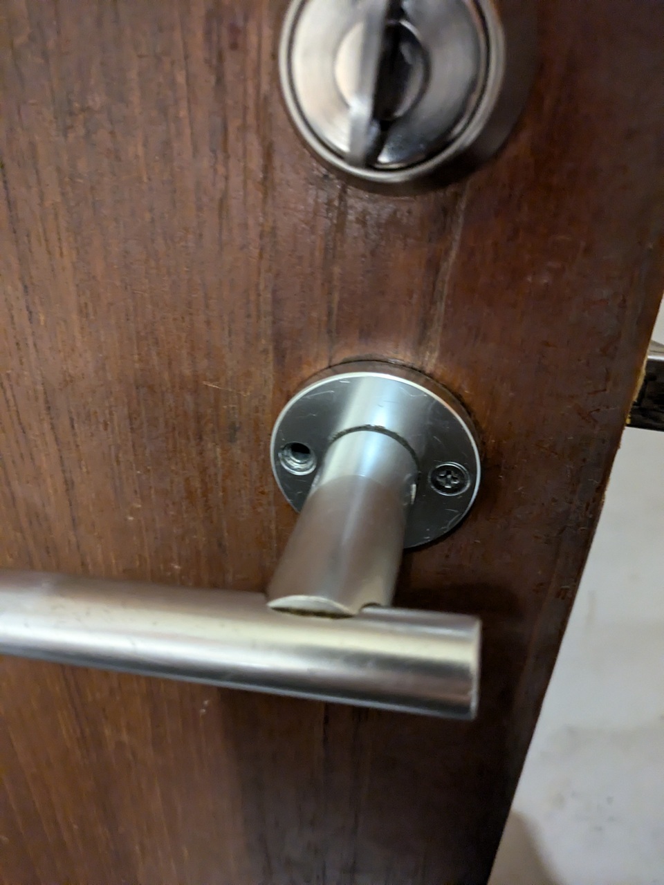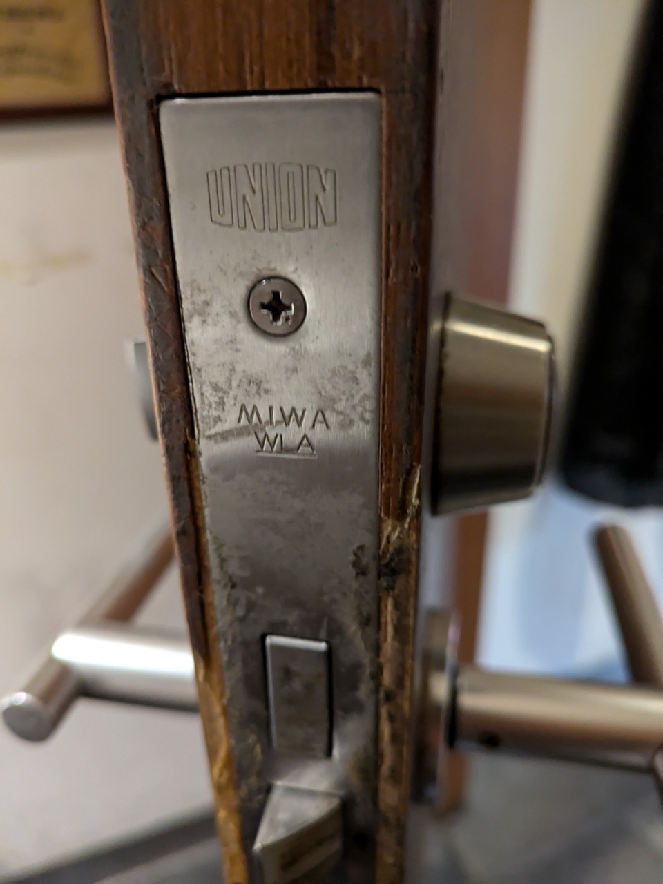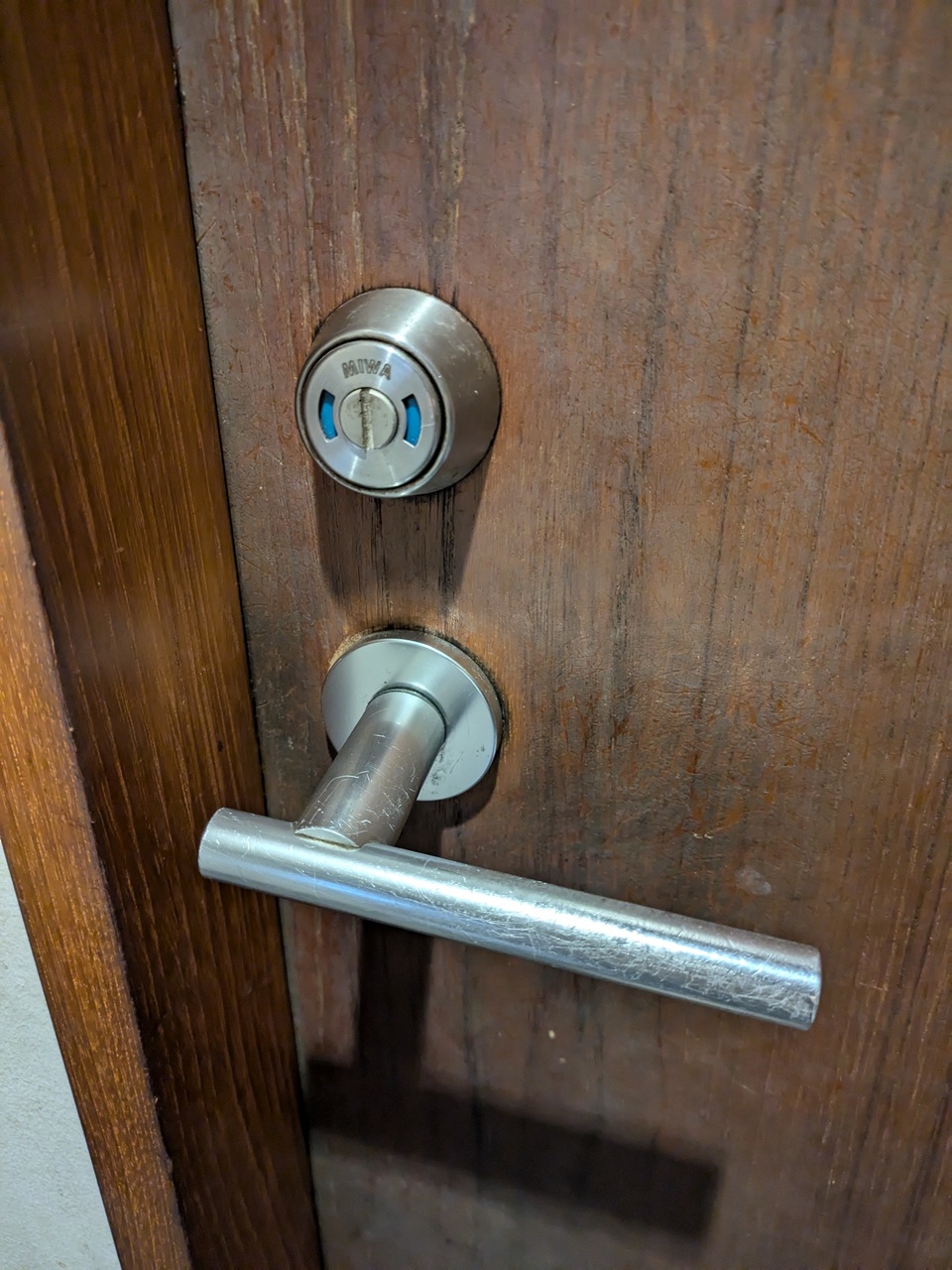 UNION OEM品(MIWA WLA)表示錠が付いたトイレの扉です。レバーハンドルが外れる度に自身で付けたそうですがネジが1本欠損しています。